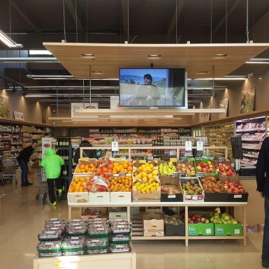 La fachada a la calle es totalmente acristalada invitando la entrada de los peatones, el acceso en el eje de simetría permite flexibilidad a la hora de distribuir el mobiliario de exposición de productos. En este punto el edificio toma la escala del entorno, alineándose con las casas de pueblo vecinas, de planta baja y piso, unas lamas de madera verticales suspendidas, aportan plasticidad a la fachada y protegen el espacio interior a doble altura de la radiación solar directa de sur.